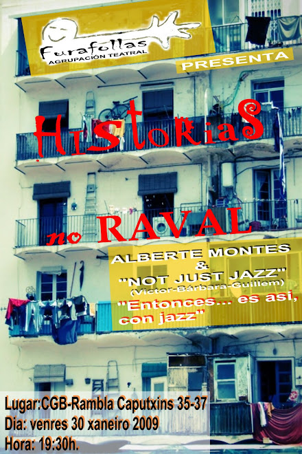 El grup teatral "Furafollas" organitza al "Centro Galego de Barcelona" (Rbles Caputxins 35 -37): "Historias No Raval" espectacle del monologuista Alberte Montes amenitzat musicalment per Not Just Jazz. Una passada d'estona per riure seguint les sortides d'humor d'aquest gallec-català al Raval dins de la maravellosa atmòsfera que crea el JAZZ. Alberte Montes és un molt jove monologuista que ja ha trepitjat un programa d'humor de TV i que ha demanat a Not Just Jazz (3 joves estudiants de Jazz: veu, piano i bateria) treballar junts el divendres 30 de GENER a les 19.30 hores. Una gran oportunitat per gaudir del talent de joves valors!!! ENTRADA LLIURE. Aforament limitat.